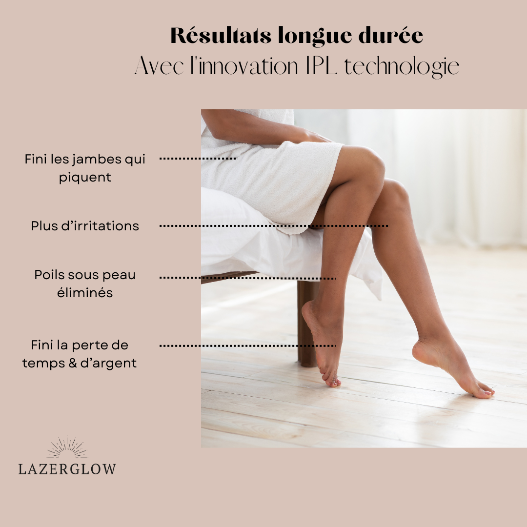 Absolument ! Un forfait complet en institut coûte environ 1500€. Avec LAZERGLOW à 290€, vous économisez plus de 1200€ tout en gardant l'appareil à vie. Sans compter le temps gagné : fini les rdv, les déplacement et l'attente. Vous retrouvez également une peau lisse et plus d'irritations liées au rasoir.